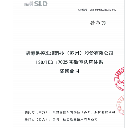 近日,SLD中检实验室技术再传喜讯,成功签约凯博易控车辆科技(苏州)股份有限公司CNAS实验室认可项目。